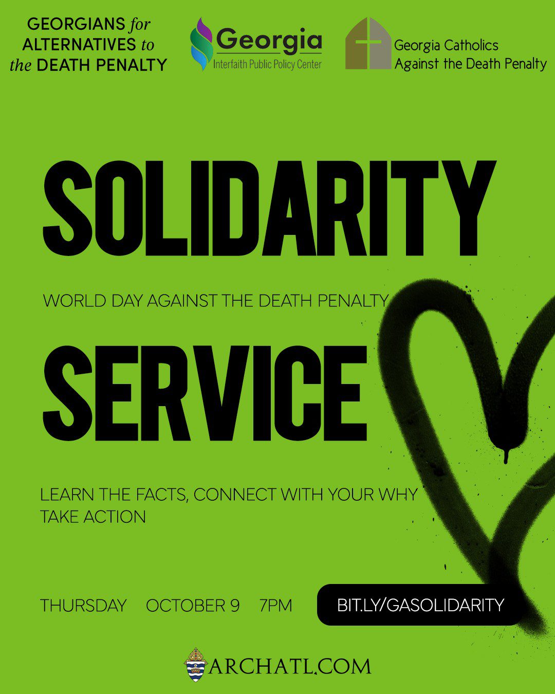 Georgians for Alternatives to the Death Penalty, Georgia Interfaith Public Policy Center and Georgia Catholics Against the Death Penalty will offer a virtual Solidarity Service on Thursday, October 9, at 7 p.m. in observance of World Day Against the Death Penalty.